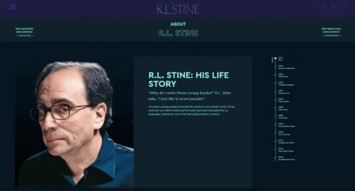 This landing page from R.L. Stine is simple but powerful since it places a lot of emphasis on the author’s past. The interactive timeline on the page highlights the author’s career path. It begins with his love of writing in school and touches on significant milestones like the release of Goosebumps. This landing page is beautifully and skillfully designed to discover more about Stine’s life.